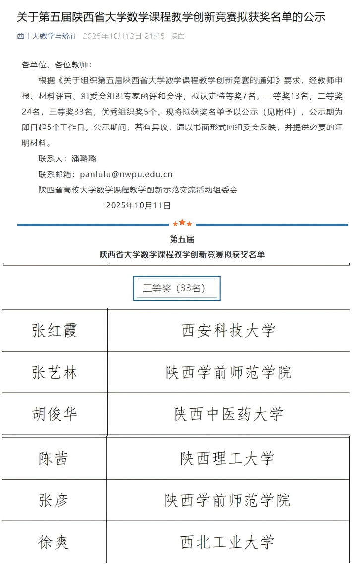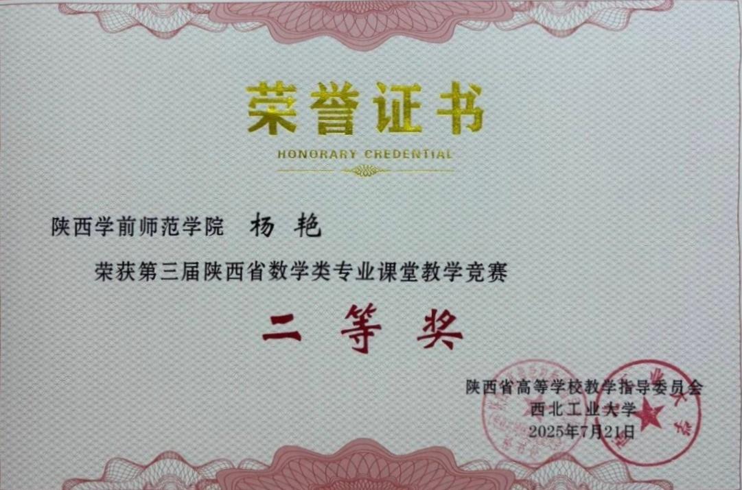 近日,在第三届陕西省数学类专业课堂教学竞赛和第五届陕西省大学数学课程教学创新竞赛上,我院教师张艺林荣获数学类专业课堂教学竞赛一等奖,杨艳荣获二等奖;张艺林和张彦分别荣获大学数学课程教学创新竞赛三等奖。