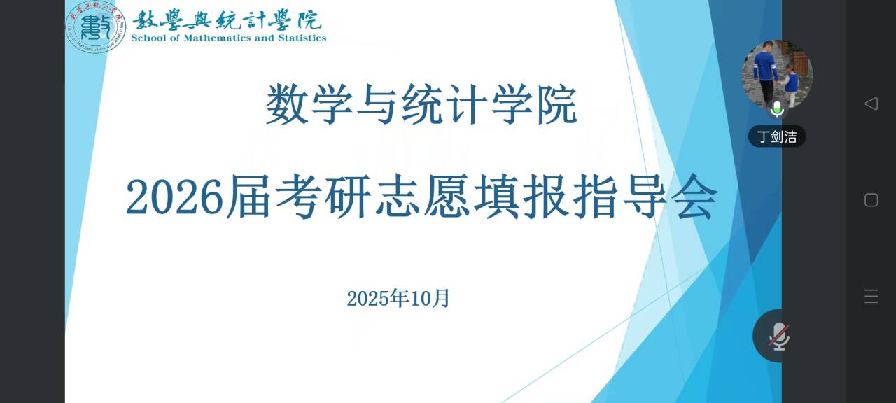 为助力2026届毕业生在考研道路上明确方向、精准规划,提高考研成功率。10月16日数学与统计学院以线上会议形式成功举办了2026届考研志愿填报指导会,学院相关领导、辅导员及全体考研学生参加会议,会议由党委副书记李强主持。