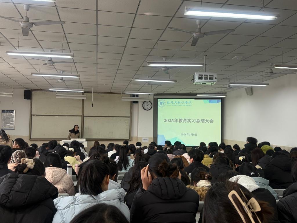 为全面复盘实习工作、系统总结成效,搭建交流成长平台,助力学子明确学业与职业方向,数学与统计学院于2026年1月6日召开2025年教育实习和生产实习总结大会。学院院长丁剑洁、副院长曹明、统计系主任杨小鹏、应用数学系副主任胡青青、辅导员何静及全体实习指导教师出席,2022级数学与应用数学、应用统计学专业全体实习生参会,会议由曹明副院长主持。