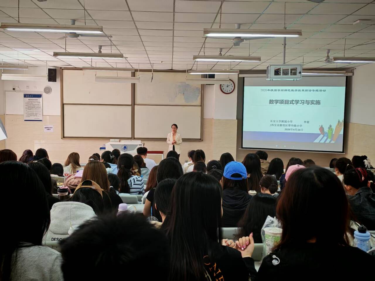 4月16日下午,学院特邀陕西省优秀教学能手李蕾老师,开展《数学项目式学习设计与实施》专题讲座。李蕾老师系统阐释项目式学习的内涵与价值,结合视频案例直观呈现教学模式,明确主题遴选需紧扣课程标准、学生实际、趣味挑战、真实实践四大维度。围绕目标设定、方法指导、内容设计、项目实施等关键环节,她强调以知识为载体、以素养发展为目标,落实“做中学、用中学、创中学”理念与四基四能三会要求,并以《手工皂》教学案例展示项目式学习的育人实效。互动环节中,同学们以小组为单位拆解案例、交流研讨,李蕾老师逐一指导,鼓励大家深耕教学实践、提升创新教学能力。
