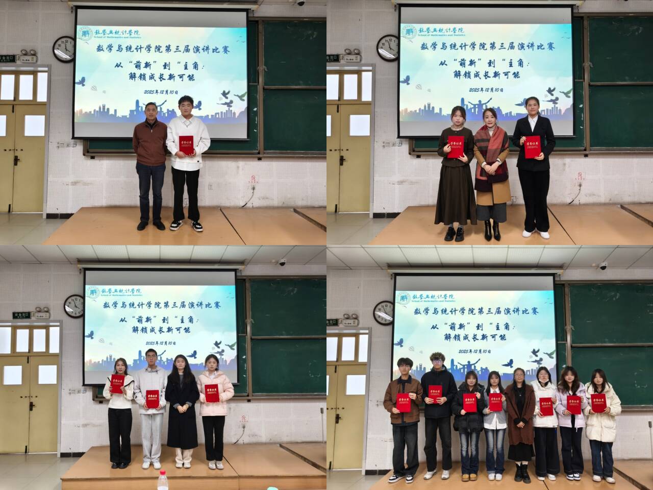此次演讲比赛不仅为数统院学子搭建了展示自我、锻炼能力的优质平台,更传递了“主动探索、勇敢尝试”的成长理念,激发了同学们对自我成长的深度思考与追求。未来,学院将持续开展丰富多样的文化活动,为同学们的全面发展注入更多活力,助力学子在青春赛道上奋力奔跑、实现蜕变。
